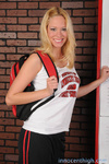 Short-haired blonde babe in pink leggings takes a dick from behind