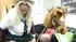 Blond dude bound to a stand gets his balls in a shackle flogged and abused by busty mistress